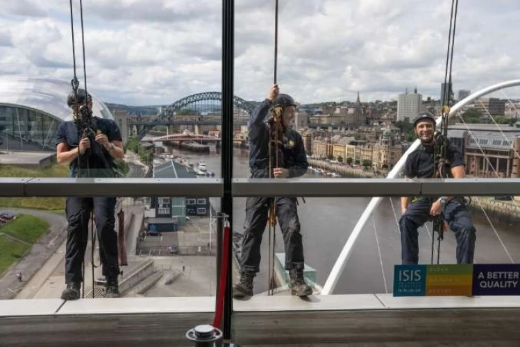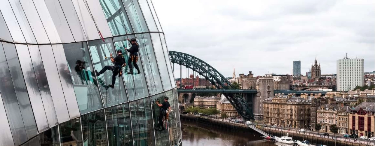 ISIS has a large array of clients for whom we carry out specialist window cleaning, some sites being very unique in how we access them. Sage in Gateshead for example, due to the curvature of the building it makes it difficult but achievable to safely carry out the clean through our experience. Many clients are surprised with the capabilities of using rope access to carry out cleans. We generally use the traditional method of window cleaning whilist abseiling, ensuring that all tools are connected by lanyard to the technicians, so there is no risk of the tools falling.